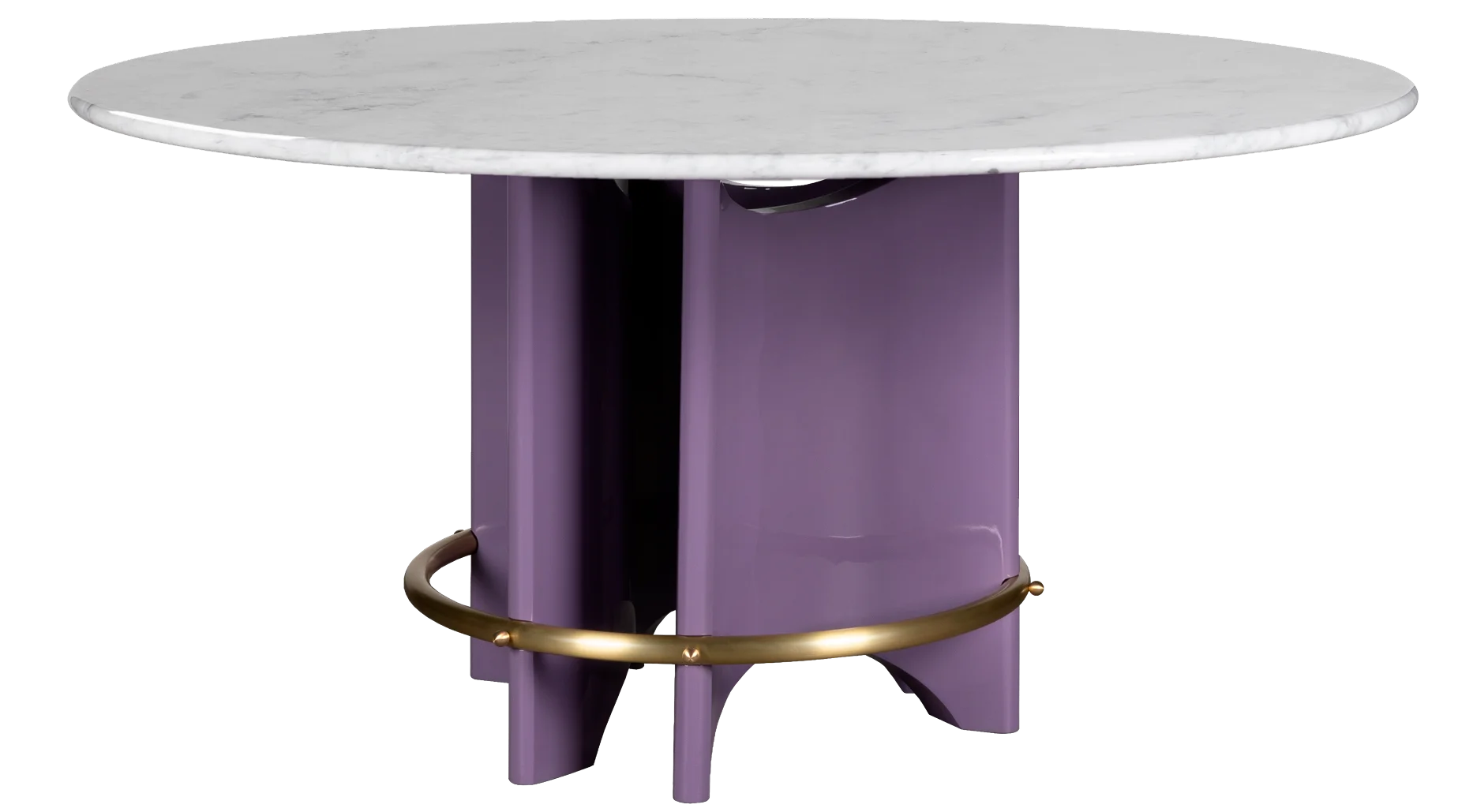 Handcrafted with precision, this circular dining table features a sleek premium marble top supported by a sculptural lacquered base of three rolled structures connected by a brass ring. Exposed screws accentuate its bold, artistic character, while the combination of marble, lacquered geometry, and brass detail ensures durability and refined elegance. This designer table transforms any dining space into a centerpiece of modern luxury interiors.