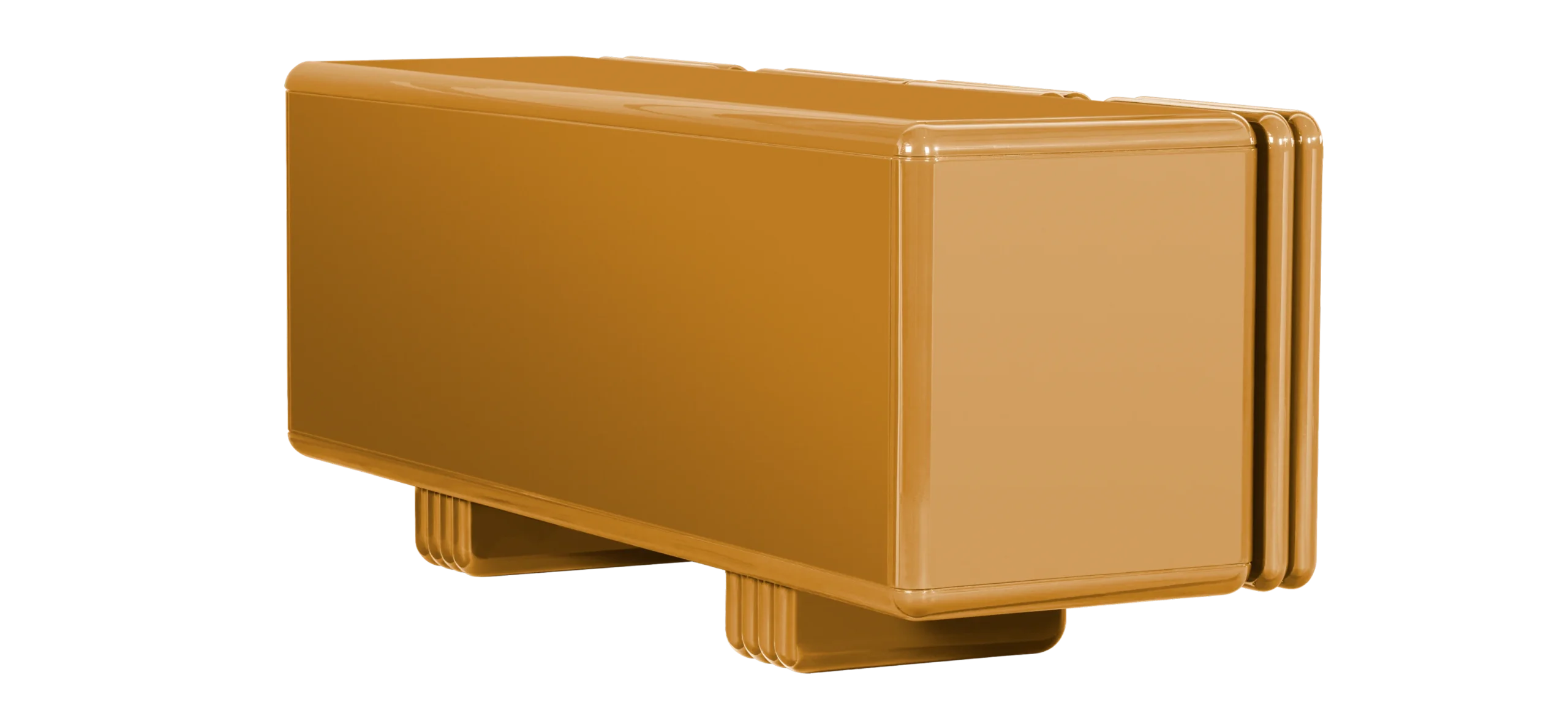 The Monolithic Sideboard is a luxury sideboard with bold, sweeping curves, precisely lacquered in any RAL/NCS color, available in matte or high gloss finishes. Its four doors open on brushed-brass hinges, masterfully crafted in the shape of a world cut in half, a distinctive detail that enhances its sculptural character.